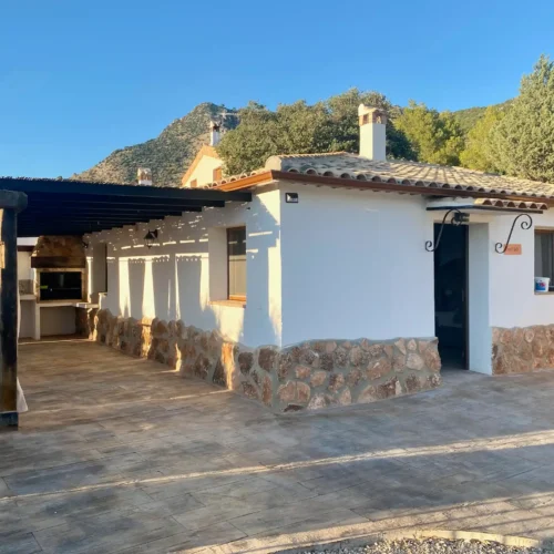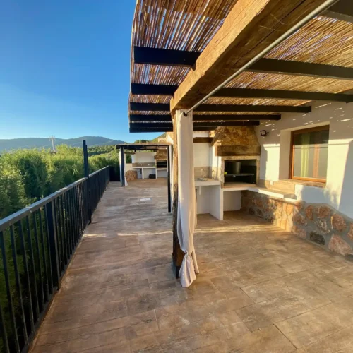 La casa cuenta con un salón luminoso, cocina integrada, dormitorio doble y baño completo, además de una amplia terraza privada con porche y barbacoa.